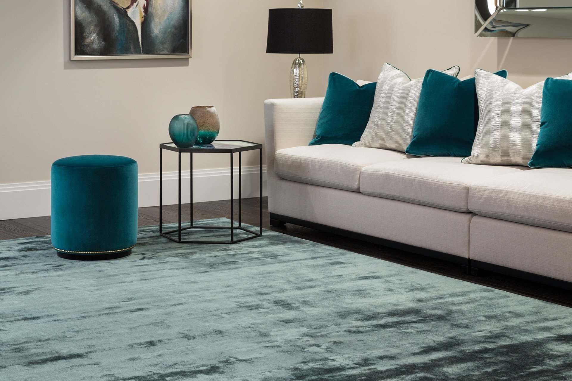 Modern, statement stripes of complimentary shades in a cool viscose pile.
